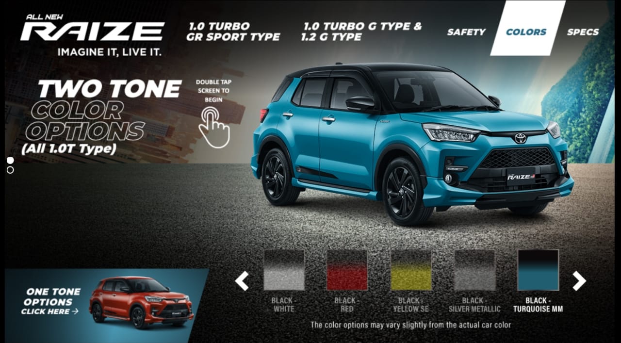 Toyota Raize tersedia dalam 11 warna yang berbeda - Black, White, Yellow, Red, Silver Metallic, Grey Metallic, Yellow Black, White Black, Red Black, Turquoise MM Black and Turquoise MM